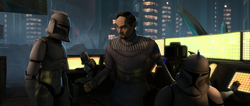Skywalker states that the ship is pretty small to destroy an entire fleet. Kenobi Responds to Anakin by stating that he won't be fighting. Kenobi tells Skywalker that he wants him to run a relief mission down to the planet's surface for Bail Organa and the Christophsians. This causes Skywalker to get irritated with Kenobi, stating that he was "still the delivery boy." Meanwhile, Admiral Yularen does reasearch on the opposing flagship to realize that the ship is the flagship of none other Trench. Yularen is shocked and comns an officer to tell them to hold skywalkers departure. Skywalker ask the Admiral the reason for holding his departure. Yularen tells Skywalker that he recognized the tactics of Admiral Trench. Skywalker replies stating that "if I remember my military history, wasn't he vaporized at the battle of Malastare Narrows?" Yularen confirms this but states that the tactics and strategies were the same. Yularen also shows Skywalker a symbol that was on Trench's flagship that told others who was in command of said vessel. Yularen states that he's seen Trench's work first hand. Skywalker allows Yularen to assist him in his "relief mission. They board the stealth ship and activate the cloaking device.